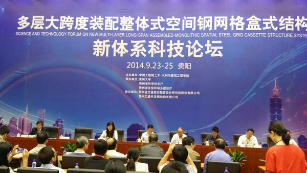 9月24日至25日,由中國工程院土木、水利與建筑工程學部主辦,貴州大學、貴州省科技廳、貴州省住建廳等承辦的“多層大跨度裝配整體式空間鋼網格盒式結構新體系科技論壇”在貴陽開幕,論壇邀請中國工程院周豐峻院士、杜彥良院士、肖緒文院士、郭仁忠院士以及中國工程院土木、水利與建筑工程學部學術委員和來自國內各知名高校、科研院所、設計院、鋼結構行業(yè)知名企業(yè)二百余人參加,經過現(xiàn)場考察、主題報告、學術交流研討,形成對中國工程院士馬克儉“盒式結構新體系”的論證意見。意見認為:該體系以“產、學、研”結合方式進行科學技術成果的研發(fā)與轉化,是理論與實踐相結合的良好形式,是落實“實施創(chuàng)新驅動發(fā)展戰(zhàn)略”的有效舉措。該項目取得了良好的社會經濟環(huán)境效益,有良好的推廣應用前景,經典集團董事長苗樹文應邀參加“盒式結構新體系”研討,并與馬克儉、肖緒文等院士互動學習交流,并觀摩了中國南車集團貴陽新產業(yè)基地大自然工業(yè)園芯料生產廠房、貴州省博物館新館等“盒式結構新體系”應用示范單位。