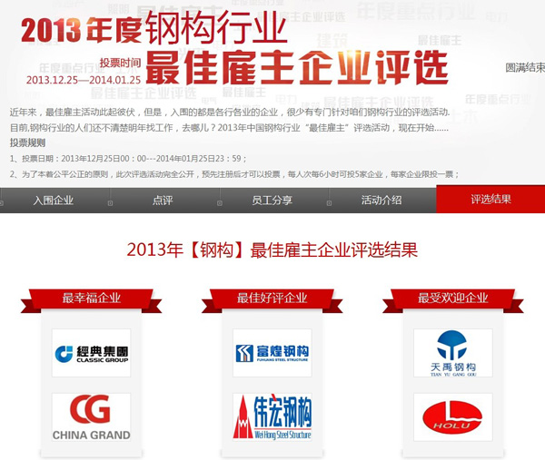 近日,山東經典重工集團股份有限公司在一覽鋼構英才網舉辦的2013年度鋼構行業(yè)最佳雇主企業(yè)評選中榮獲最幸福企業(yè)獎。