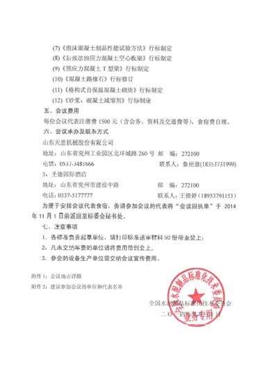 11月7日-9日全國(guó)水泥制品標(biāo)準(zhǔn)化技術(shù)委員會(huì)2014年年會(huì)暨標(biāo)準(zhǔn)審查會(huì)在山東天意機(jī)械股份有限公司隆重召開(kāi)。屆時(shí),委員會(huì)相關(guān)領(lǐng)導(dǎo)及行業(yè)相關(guān)科研人員將蒞臨會(huì)議,共同商討制訂行業(yè)有關(guān)標(biāo)準(zhǔn)。誠(chéng)邀各界人士屆時(shí)蒞臨天意機(jī)械、經(jīng)典集團(tuán)、卓越精工參觀指導(dǎo)。