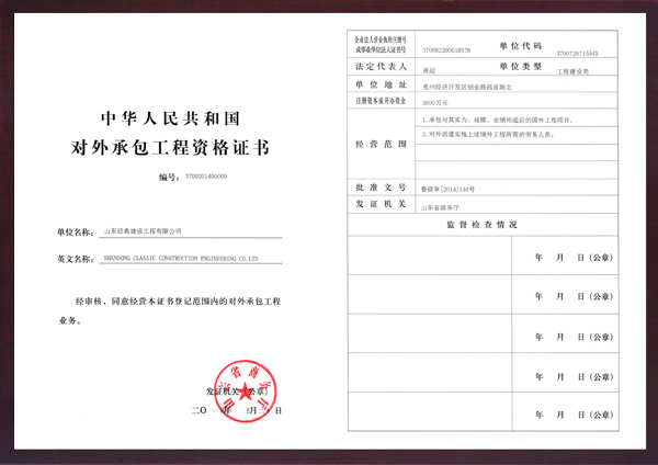 近日,山東經(jīng)典建設(shè)工程有限公司對外承包工程業(yè)務(wù)經(jīng)山東省商務(wù)廳批準(zhǔn),獲得了《中華人民共和國對外承包工程資格證書》。至此,山東經(jīng)典建設(shè)工程有限公司具備了承包對外工程項目資格。